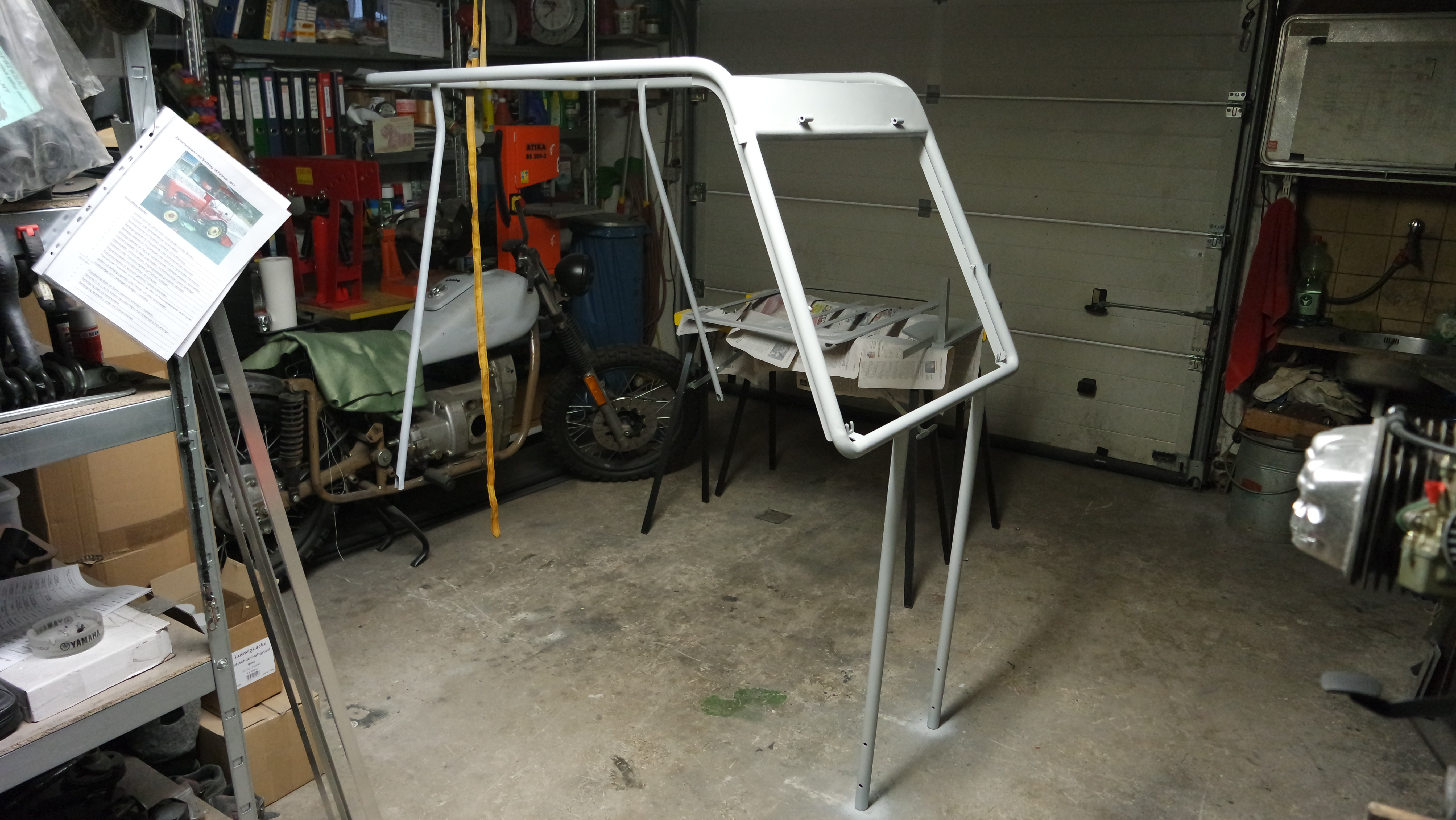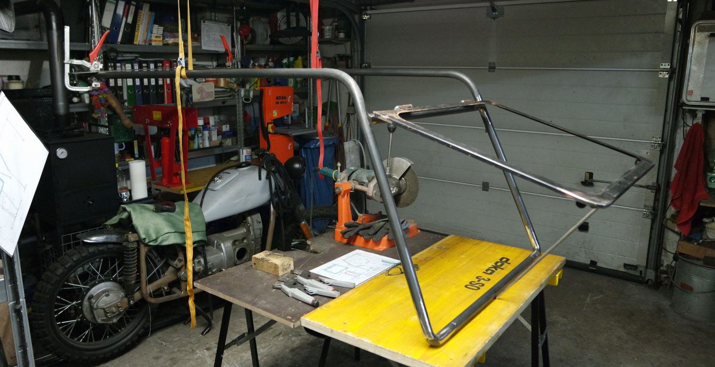 Zeus und ich haben die schwierigste Arbeit am Verdeck hinter uns gebracht, das Grundgestell ist fertig. Sehr viel Messarbeiten und Probemontagen waren nötig um ein möglichst kleines Verdeck anpassen zu können. Was auch sehr wichtig ist, das Grundgestell ist durch die dünnen Rohre sehr leicht geblieben, jedoch war beim Schweißen Vorsicht angesagt. Der nächste Schritt wird sein, das Grundgestell und den Fensterrahmen zu lackieren, bevor mit der Montage vom Dach und Frontteil begonnen werden kann.