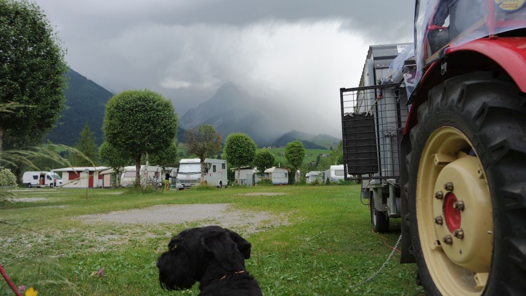 Wildshut – Um 7:00 Uhr starteten wir bei ganzen 12°C und Regen die heutige Etappe. Der Vormittag war nur verregnet, ab Mittag verzogen die Wolken und die Sonne strahlte wieder. Bei der Stadtdurchfahrt in Salzburg waren wir wieder einmal ein Blickfang für die Touristen. In Oberreching gab es wieder ein tolles Erlebnis. Ein am Straßenrand stehender Mann winkte zum anhalten, wir hielten an und Parkten genau vor einer Konditorei wohin uns der Mann einlud. Innerhalb weniger Minuten trafen 4 weitere Personen ein, die er per Handy angerufen hatte. Nach der gewohnten Fragestunde bekam ich noch vom Gastgeber (Reiterhofbesitzer des Ortes) die Einladung auf seine Kosten in der Konditorei Einkaufen zu gehen, was ich natürlich ablehnte. Nach der netten Einkehr, fuhren wir Richtung Wildshut, Riedersbach weiter. Bin auch heute wieder sehr müde, aber auch Zeus legt sich bei den Stopps gerne neben den Wagen. Bereits um 15:00 Uhr und gefahrenen 91km war ich froh in Ettenau am Waldesrand einen Nachtplatz gefunden zu haben. Mir kommt vor durch das viele Fahren mit geringer Drehzahl hat meine Batterie nicht mehr 100% Leistung, weshalb ich sie sicherheitshalber für 1-2 Std ans Ladegerät hängen werde.