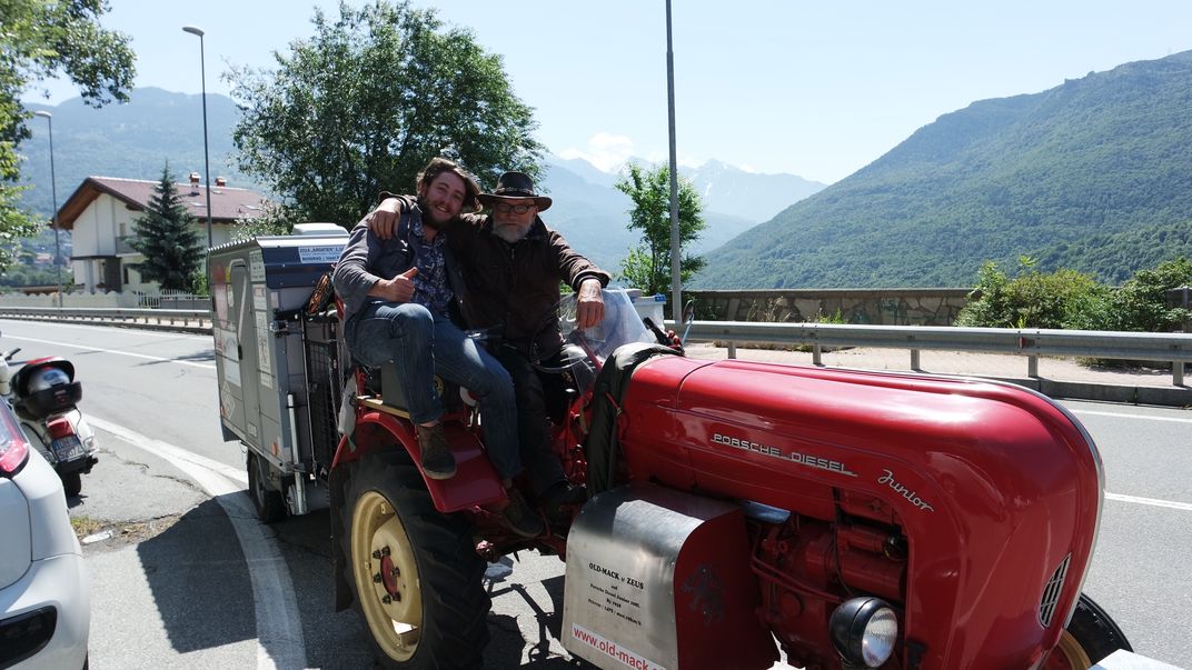 Es begann bereits in der Morgensonne, die Passüberfahrt nach Bourg St.Maurice über Cornet de Roselend, schmal, steil 1:30 Std. Auffahrt im 2.Gang= 10km/h. Es folgte auch gleich die Auffahrt auf den St.Bernhard-Pass (Grenze zu Italien) 24km im 2.Gang= rund 3 Std. bis zur Passhöhe. Das Wetter war ein Traum, auch der schönste Tag von den Eindrücken her. Bei ca. 2.000 Höhenmeter verliert mein Porsche merklich an Leistung, läuft sonst wieder wie ein Uhrwerk (Danke Gerhart v. Porsche-Traktormuseum für den Fern-Tip!) Ich glaube Zeus will mich aufbauen, seit den letzten Tagen legt er bei jeder Pause neben mir sitzend die Schnauze auf meinen Oberschenkel…….ist eben ein echter Partner! Positiv, gesundheitlich keine Verschlechterung, Füße werden besser (dank Venenstrümpfe und Salbe?) mit der Taubheit in der linken Hand lebe ich, das was bleibt, mir ist am Rücken noch immer kalt…….wird schon werden
