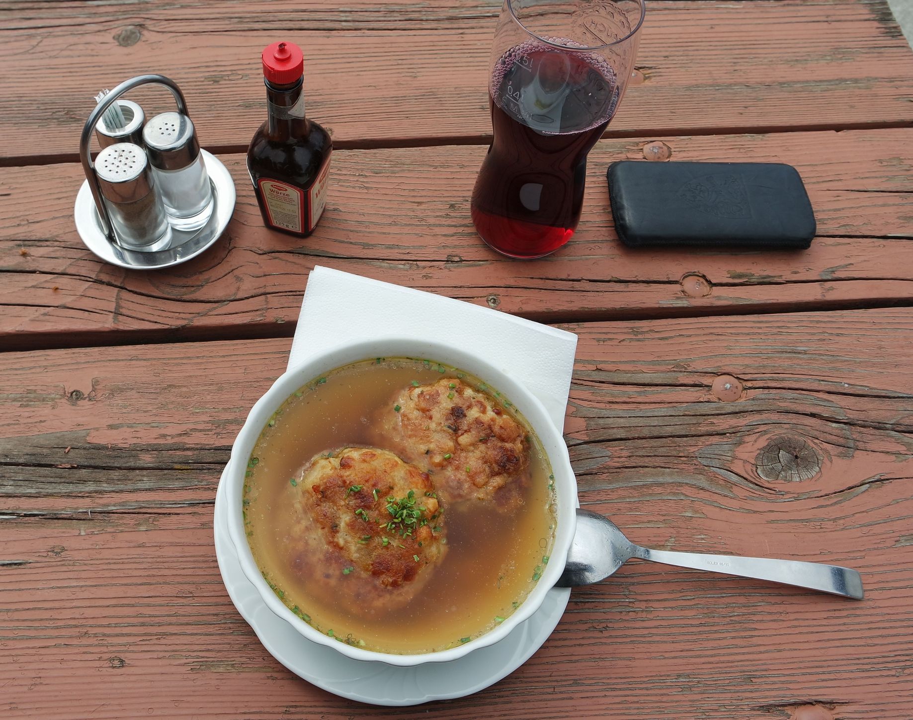 leicht ins Schwitzen. Der nächste Höhepunkt, die “Kaspressknödelsuppe” bei Vroni &